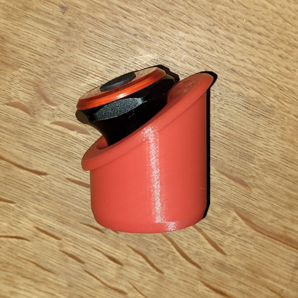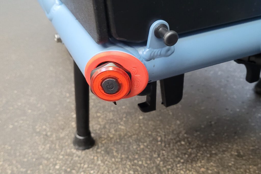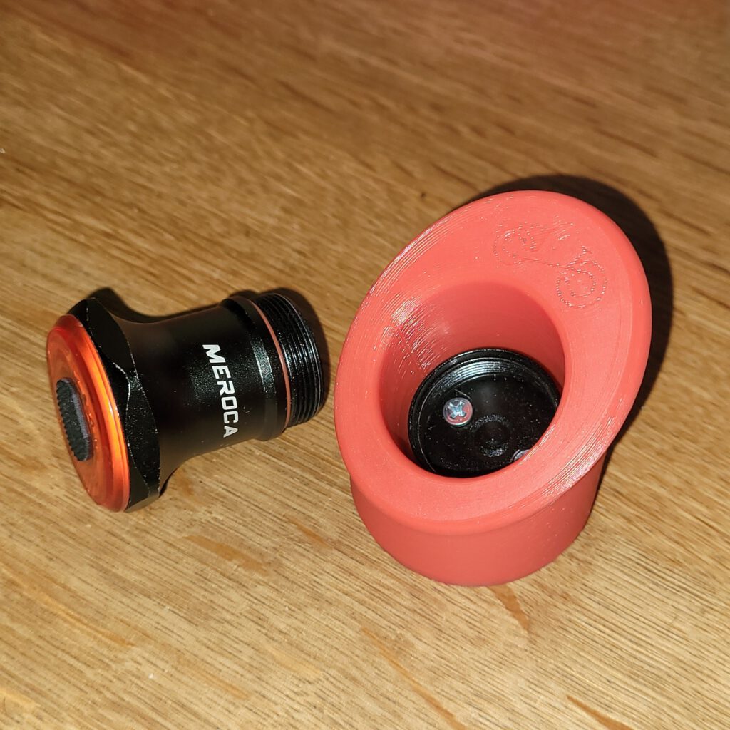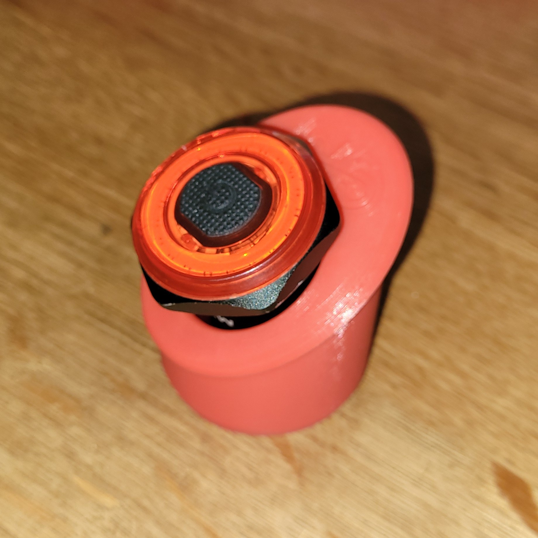 Statt der Reflektoren lässt sich aber auch mit wenig Aufwand ein Akku-betriebenes Rücklicht realisieren. Die Endkappe im Rahmen-Rohr ist dafür prädestiniert, und bietet eine große Fläche zum Befestigen verschiedenster Leuchten. Ich habe eine neue Endkappe konstruiert, die das versenkte Montieren eines runden Rücklichtes erlaubt. Diese sind in vielen Varianten (meist für die Montage am Sattelgestell) erhältlich. Zum Laden werden sie einfach aus der Halterung geschraubt.