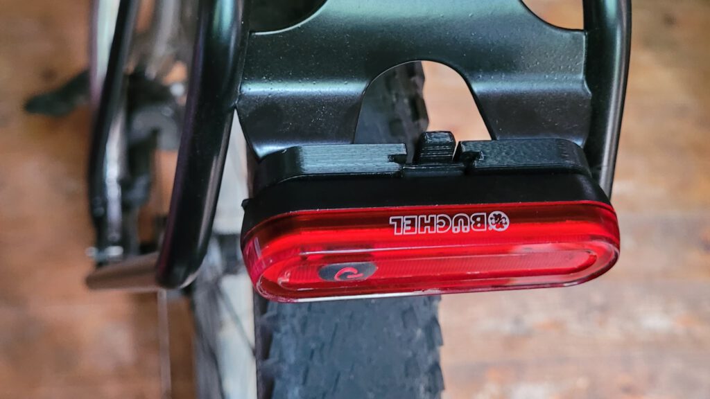 Mir hat das Büchel Micro Lens COB Stoptech zugesagt, ein schlankes Rücklicht mit schönem Lichtbild und Helligkeitssensor, das tags und nachts mit Bremslicht aufwartet. Da die Gummibandhalterung bei mir nicht an die Sattelstütze passt (und ich kein Freund von Gummibändern bin), habe ich das Licht unter dem Sattel verschraubt. Als Adapter für eine noch vorhandene Sitzgestell-Schelle habe ich einen Halter konstruiert und gedruckt, der wie das Original-Spannband am Büchel-Klips verschraubt wird und auch die Neigungsverstellung erlaubt. So passt das Rücklicht formschön unter das Sattelgestell.